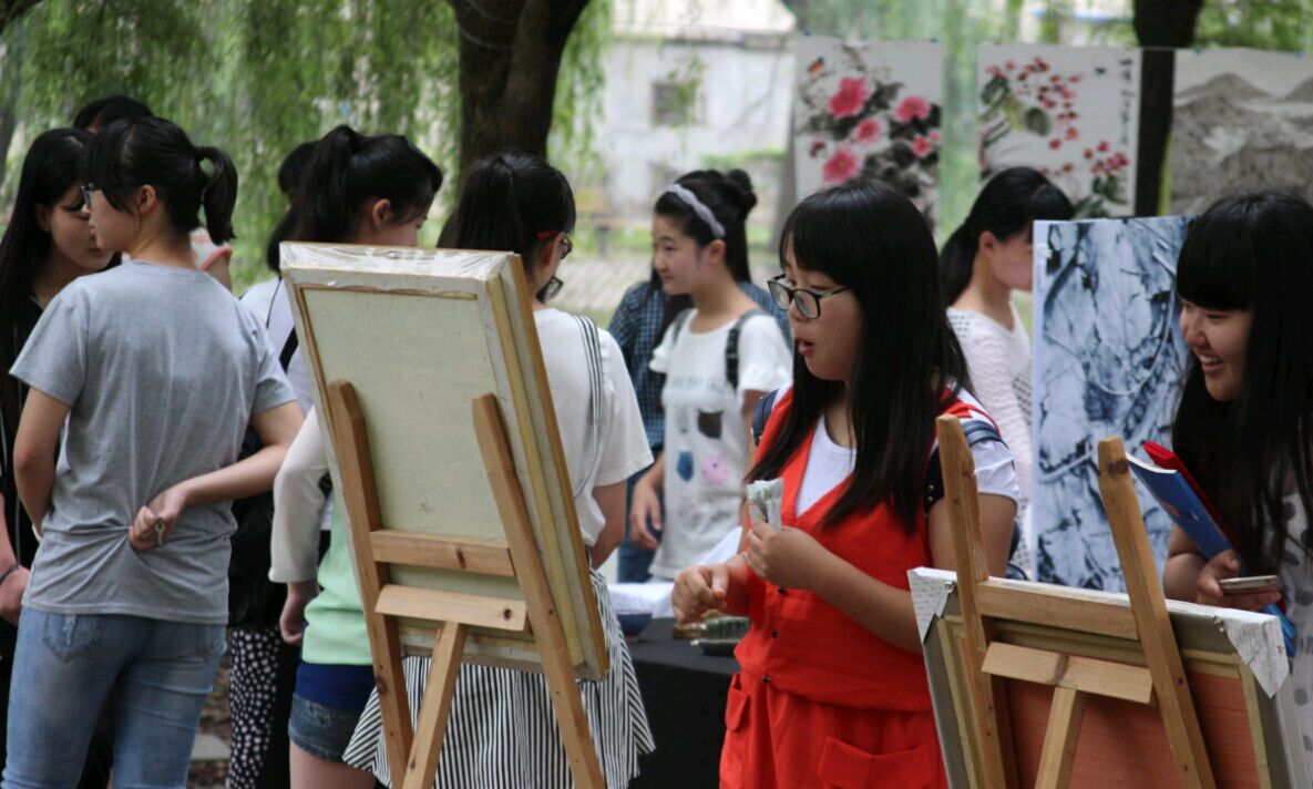 室外场设在美术楼门口的小树林里,主要展示了200余件在校同学的作品,内容广泛,形式多样。这里同样也吸引了很多其他院系的师生过来参观,大家纷纷拿出手机,拍下自己喜欢的作品留念。国画班的同学进行的书法表演、手绘社的同学现场为参观的同学在T恤衫上进行绘画;最受师生们欢迎的,还是陶艺制作的展台,这里不但人流如织,甚至还吸引了一位来公司讲学的意大利专家亲自下场,体验陶艺制作。