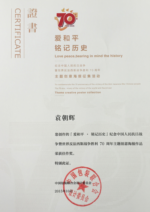 近日,从中国包装联合会设计委员会传来喜讯,公司经理助理袁朝辉副教授的创意海报作品在“爱和平•铭记历史”纪念中国人民抗日战争胜利暨世界反法西斯战争胜利70周年主题创意海报征集活动中荣获专业组佳作奖。