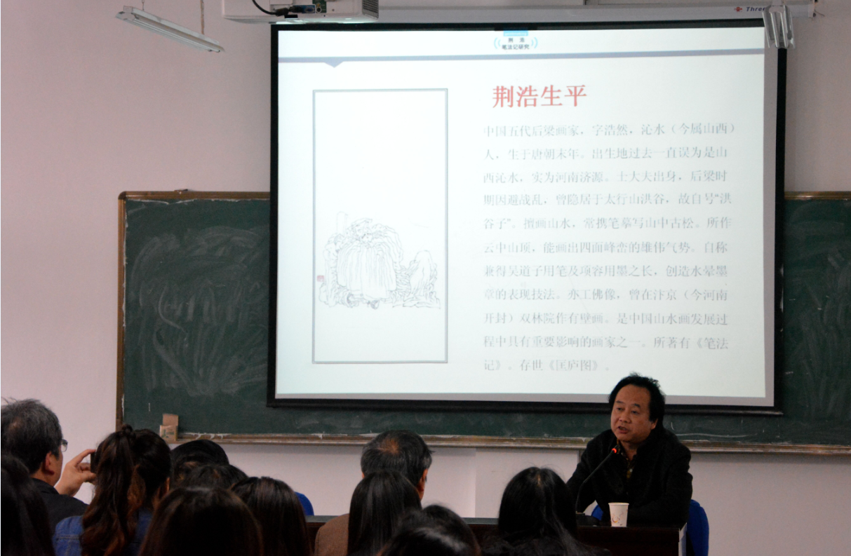 通讯员(黄思琪)4月19日上午,湖北省美术家协会副秘书长刘春冰应邀来williamhill英国官网举办“荆浩笔法记研究”为主题的学术讲座,讲座在williamhill英国官网A202教室举行,由公司副经理冯松涛教授主持。