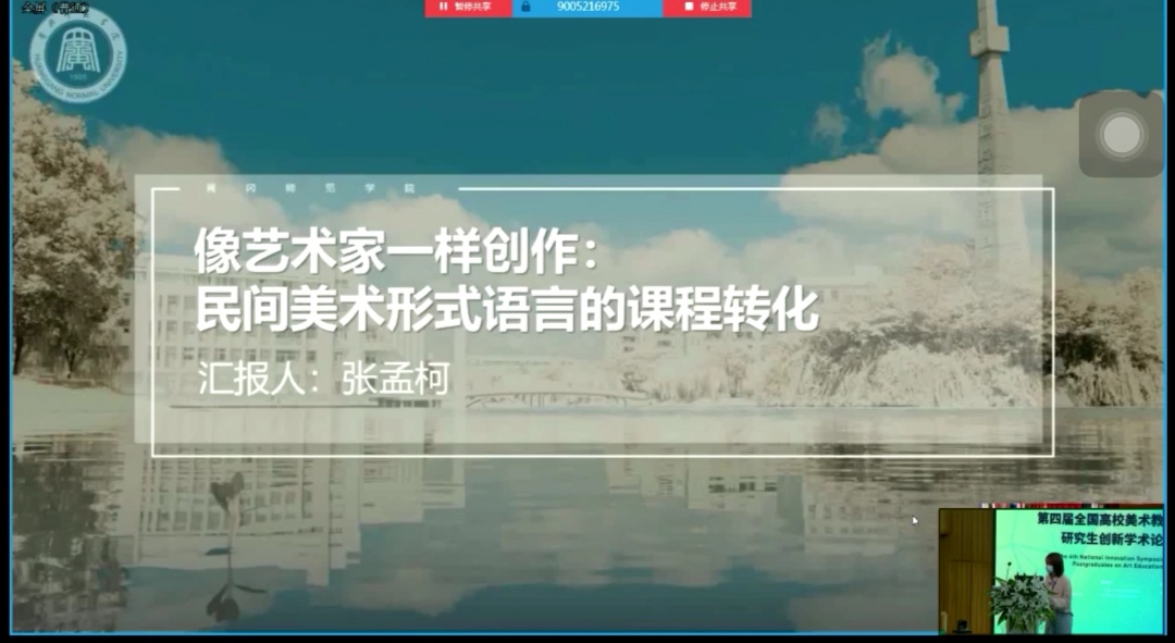 本次学术论坛以线上线下结合的方式进行,张秋萌在线上报告了自己的论文《张之洞湖北新政期间图画课程教育实践探索》并进行了演讲,演讲分别从教学目的,课程设置和教学方法三个角度论述张之洞从书院到新式学堂三个阶段的办学变迁来探讨,对其当今美术教育进行了反思与展望。