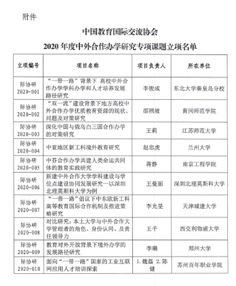 据悉,“中外合作办学研究专项课题”是为了贯彻落实《教育部等八部门关于加快和扩大新时代对外开放的意见》,聚焦“一带一路”沿线国家教育共同体建设,坚持问题导向,结合已有研究基础和工作实际,推动我国中外合作办学科学发展。此次全国高校共立项课题10项,每项资助经费1万元。
