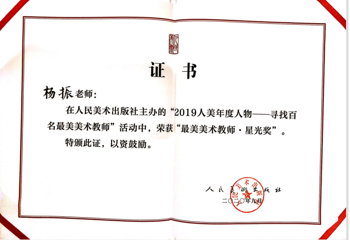 公司毕业生杨振在人民美术出版社主办的“2019人美年度教育人物——寻找百名最美美术教师”活动中,荣获“最美美术教师·星光奖”。