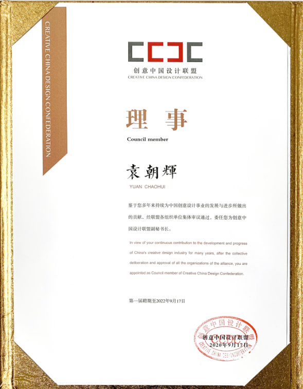 近日,公司袁朝辉教授收到创意中国设计联盟委任书,经联盟各组织单位集体审议,袁朝辉被委任为创意中国设计联盟副秘书长。