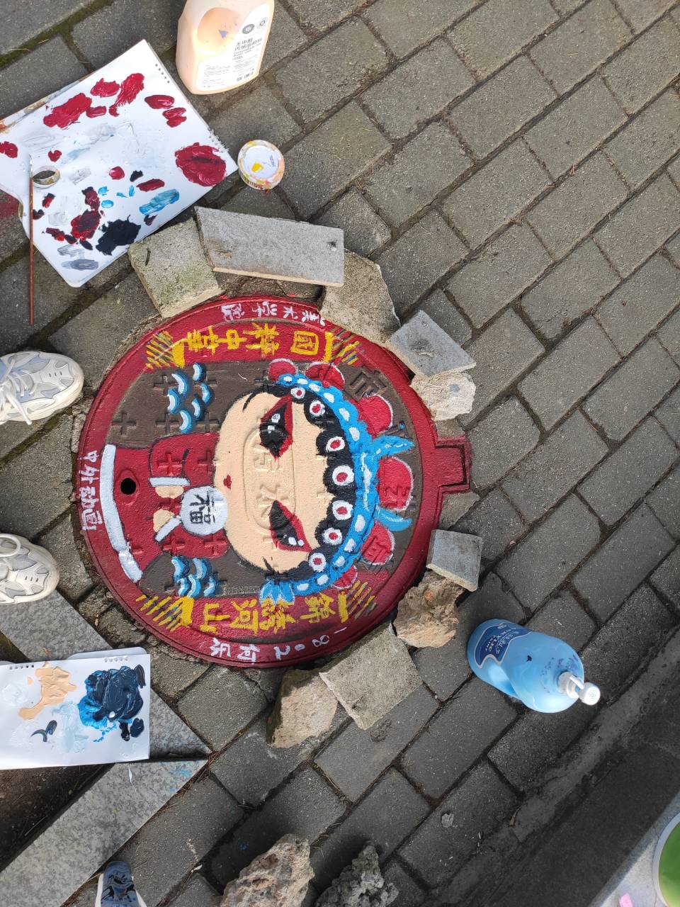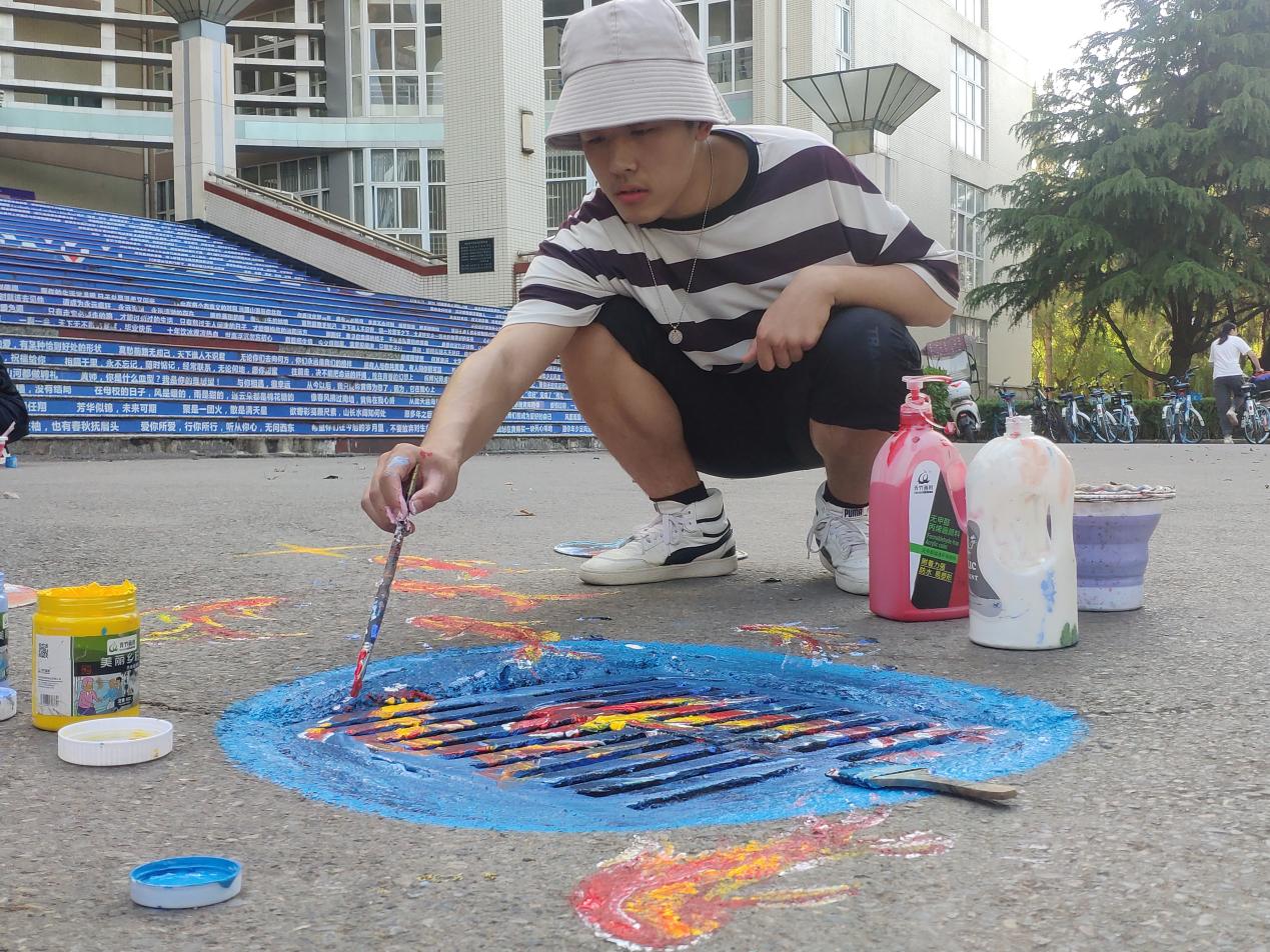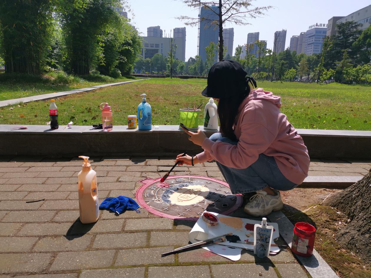 启动仪式后,志愿者们根据提前设计好的图样方案,来到各自任务分配的区域,陆续投入到紧张又热情的创作中。他们先用清水将井盖进行彻底的清洗,然后利用画笔和颜料将简单、时尚、正能量的元素融入到井盖画面中,让一个个笨重的井盖瞬间变得鲜活、生动起来。