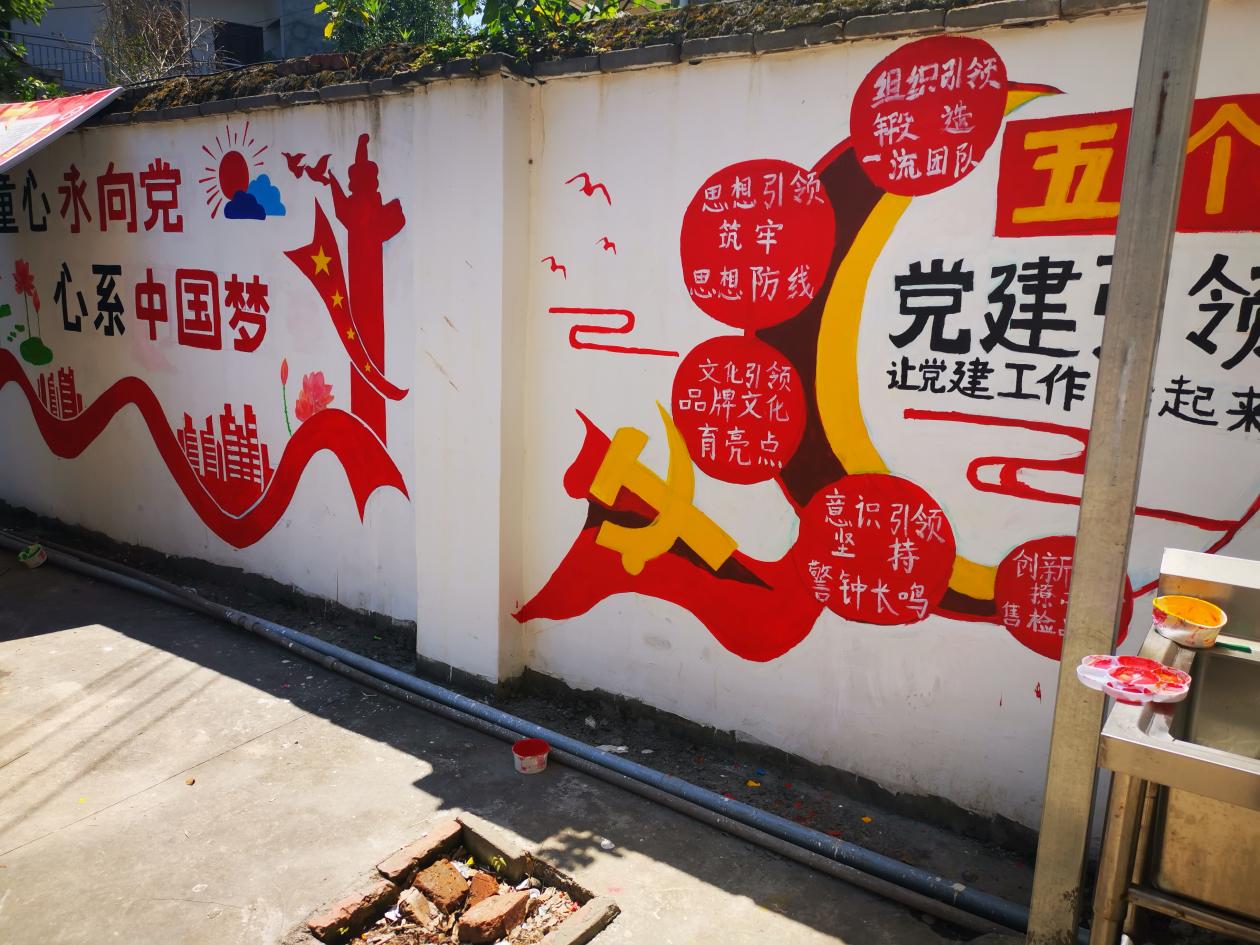 此次活动是公司党员师生和志愿者们学党史、办实事的重要举措之一,公司党委副书记陶莎,员工党支部书记周稳,公司团委书记赵震南以及员工党员、入党积极分子、“曙光乡建行”团队志愿者共56人参与了墙绘,公司组织员李斌书记共同参与了此次活动。