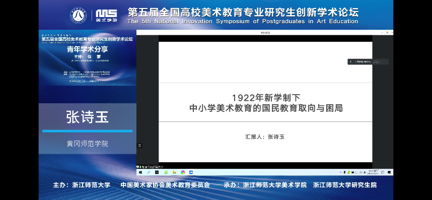 张诗玉在线上汇报了自己的论文《1922年新学制下中小学美术教育的国民教育取向与困局》,分别从什么是新学制、为什么新学制下中小学美术教育会带有国民教育取向、它是如何承担国民教育任务以及在实施中存在哪些困局等几个问题进行了探索,对当今新时代的中小学美术教育予以了一定的启示。