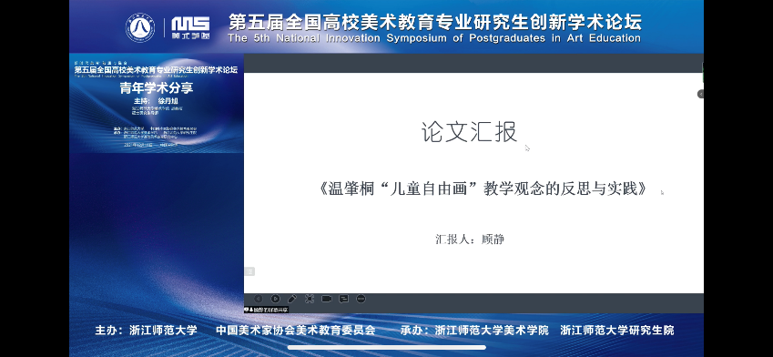 论坛以“新时代美育:融通与整合”为主题,通过线上线下相结合的方式进行。顾静在线上汇报了自己的论文《温肇桐“儿童自由画”教学观念的反思与实践》,分别从二十世纪上半叶“自由画”热潮与教学理念的争议和温肇桐“儿童自由画”教学观念与指导方法,对“自由画”的概念以及温肇桐对于“儿童自由画”的见解进行了详细阐述。同时,对当今“自由画”观念的延续进行了实践与反思。