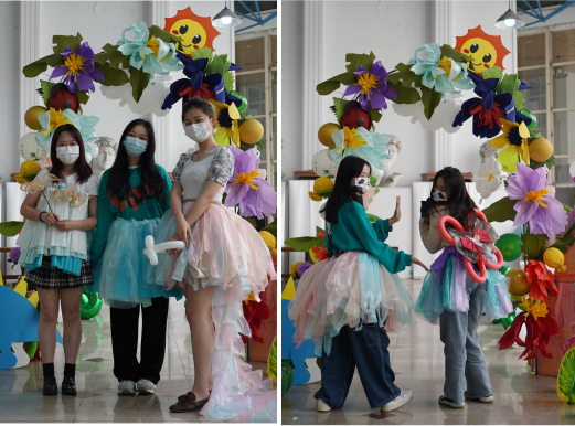 旧衣服、环保袋、饮料瓶、快递盒……在团队成员和小朋友们的奇思妙想和巧手装扮下,这些废旧材料摇身一变,成了一件件精美的环保时装。“T台”上的纸花颜色鲜艳,羽羽如生,是同学们利用平时上课剩下的材料制作,两侧生动的卡通立牌和城堡是废旧纸箱经过剪裁涂上了颜色。