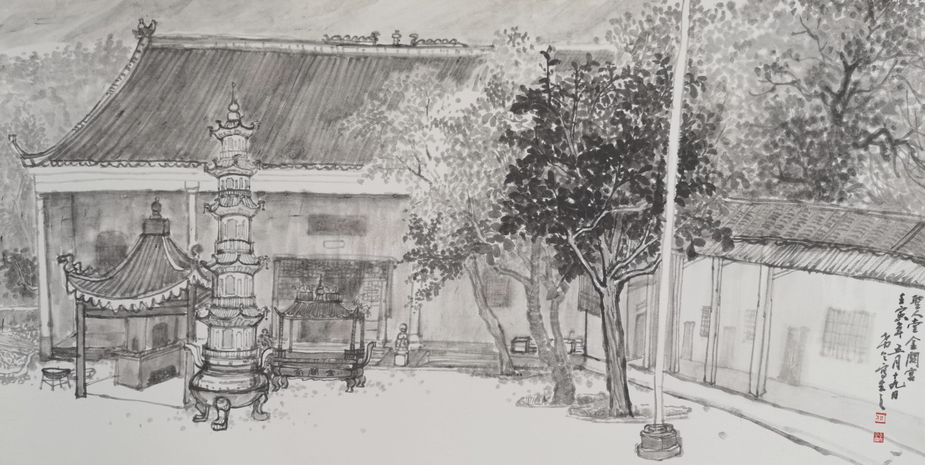 来自中国、美国、韩国、法国等国家50多名艺术家的绘画、视觉艺术、雕塑、陶瓷及影像作品参加了本次展览。公司柯希仑副教授创作的国画作品《圣人堂金阙宫》受邀参加本次展览。
