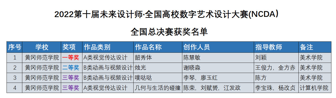 2022第十届未来设计师·全国高校数字艺术设计大赛(NCDA)全国总决赛获奖名单公布,公司选送的作品获得国家级奖项4项,其中一等奖1项、二等奖1项、三等奖2项。