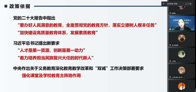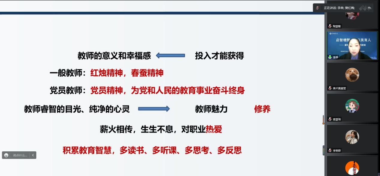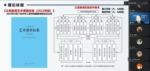 讲座中李老师从踏足美育新要求,树立跨学科融合新理念、初中美术跨学科融合活动课程的教学实践、踔厉奋进,启智增慧,以美育人等方面进行了讲解。