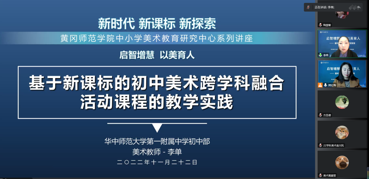 本次讲座邀请了华中师范大学第一附属中学初中部美术教师李单老师,李老师有着丰富的教学经验,是武汉市优秀美术教师、洪山区优秀青年、公司产品能手,是湖北省中学美术学科教学指南研制工作小组成员。本次讲座的主题是“基于新课标的初中美术跨学科融合活动课程的教学实践”。