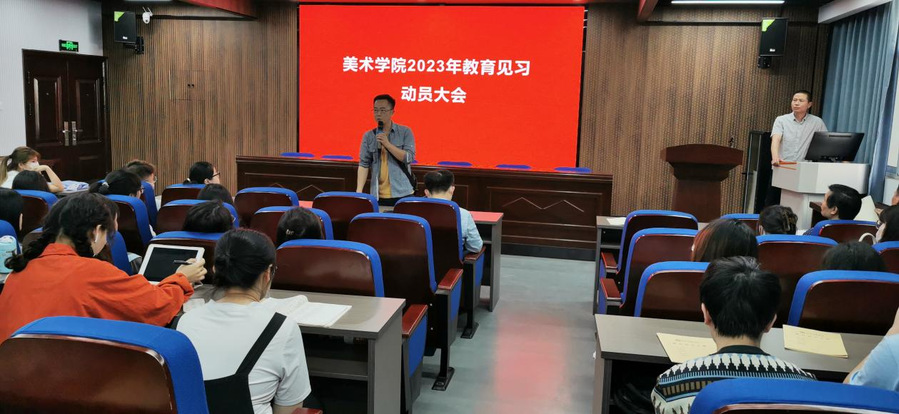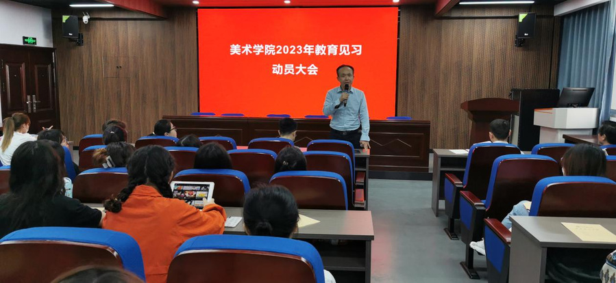 2023年4月17日上午,美术学系组织召开2023年教育见习动员会,williamhill英国官网副经理舒开智、经理助理童坤、美术系主任朱君、全体见习指导教师、2020级全体员工以及教学办秘书参加了会议,会议由童坤主持。