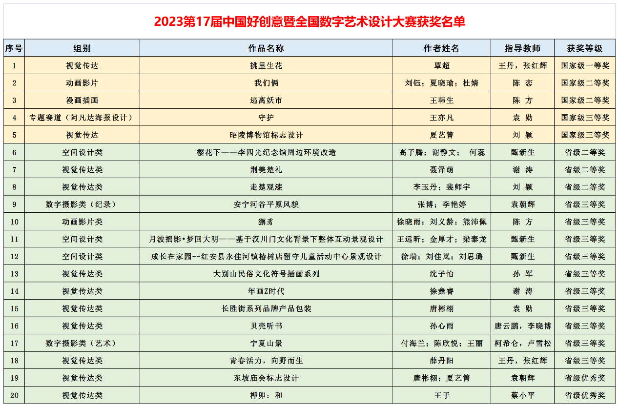 近日,2023第17届中国好创意暨全国数字艺术设计大赛最终获奖名单公布,公司经过校级赛选送的作品获得国家级奖项5项(其中一等奖1项、二等奖2项、三等奖2项),省级奖项15项(其中二等奖3项、三等奖10项、优秀奖2项)。因赛事组织工作表现突出,公司荣获优秀组织奖。
