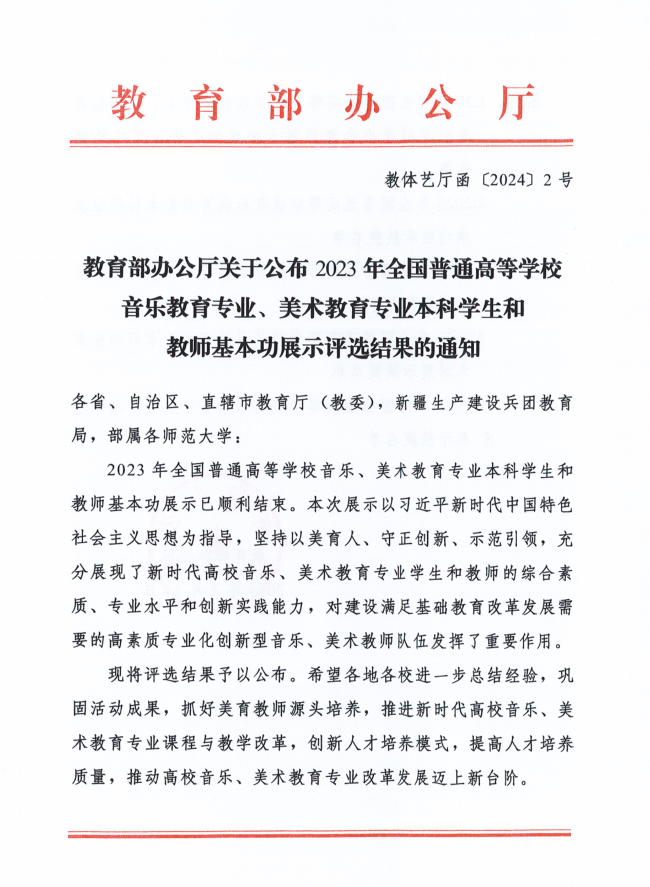 近日,教育部办公厅公布了《2023年全国普通高等公司音乐教育专业、美术教育专业本科员工和教师基本功展示评选结果》,公司获美术教育专业公司团体奖三等奖,员工获个人全能三等奖2项(张浩、张馨月),书法单项奖1项(张浩);教师获个人全能奖二等奖1项(朱君),专业技能单项奖1项(朱君)。