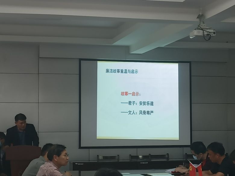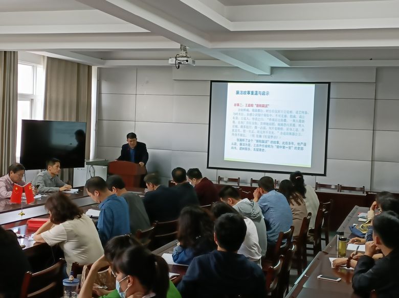 钟劲松书记围绕“苏轼过寿”、“王廷相谈履”、“李勉埋金”、“白居易断理”、“陶母退鱼”、“杨震拒金”、“王杰讽和珅”、“灭官烛看家书”等八个小故事,逐一与大家学习交流故事,分享启发和体会。