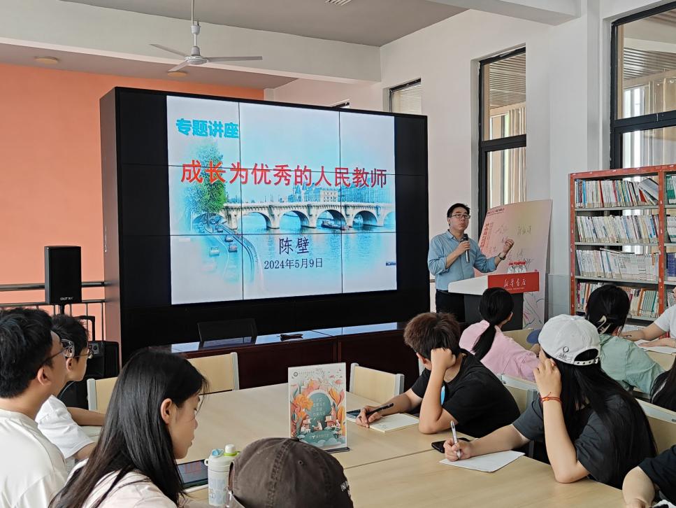 黄冈思源实验公司陈壁副董事长做了主题为《成长为优秀的人民教师》的报告。他强调优秀教师应学会欣赏、宽容、走近并关爱员工。同时,他向见习员工们提出了业务精湛、与时俱进的要求,旨在培养新时代的高素质教师队伍。