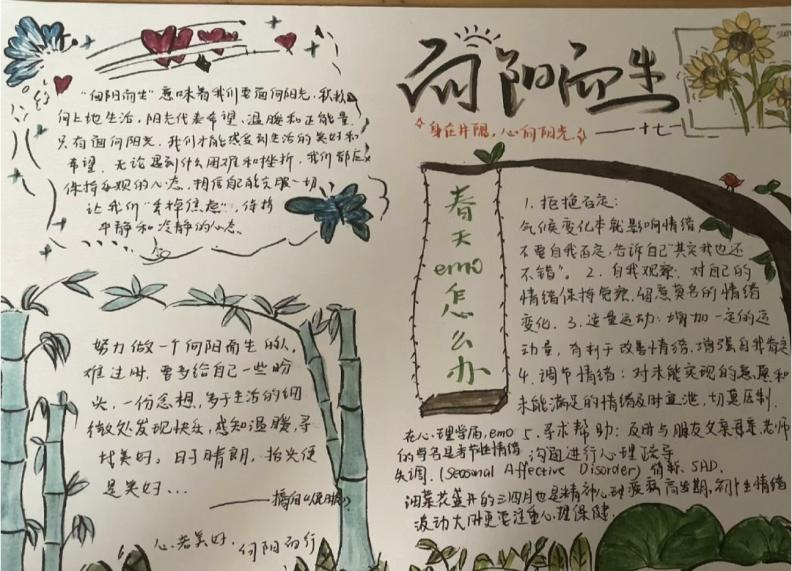 同学们纷纷拿起画笔,发挥创意,将心理健康的理念融入到手抄报中。有的以图文并茂的方式,介绍了心理健康的重要性,有的则通过生动的案例,讲述了心理健康问题的应对策略。这些手抄报作品不仅展示了同学们的创意和才华,也传递了积极、健康的心理理念。