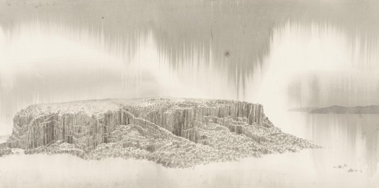 该作品完全采用传统中国画技法“渍墨法”进行创作,以笔毫的点、线、划书写,运用反复的堆栈而成,注重笔墨的古典文化厚度与人文内涵,在点、划间品味渍墨所体现的水墨美感,具有通透性、透明性的灵动,用以诠释水墨的当代性。表现对象为台湾澎湖地区的鸡善屿,为玄武岩方山台地,四周海崖的柱状节理非常清晰,景色秀丽,现为澎湖柱状玄武岩自然保留区。东海与方山在民间传说中,有仙佛之境。《海上方山——屿》结合民间传说来诠释台海澎湖之美。