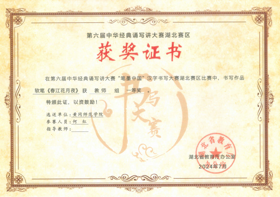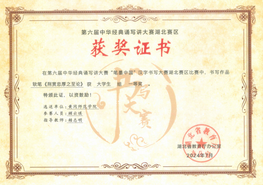 近日,第六届中华经典诵写讲大赛“笔墨中国”汉字书写大赛获奖名单揭晓。公司何红老师的作品《春江花月夜》、视传2202班顾云琪的作品《邢赏忠厚之志论》(指导老师赖志明)喜获省赛一等奖,2102班张斌涛的作品《东坡词三首》(指导老师金鑫)喜获二等奖。其中,视传2202班顾云琪的作品《邢赏忠厚之志论》(指导老师赖志明)经湖北省教育厅推荐,喜获全国优秀奖。