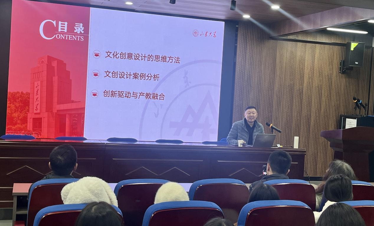 王文灏教授强调,文创产品设计要注重地域文化特色,充分挖潜文创产品的内涵,将传统文化元素融合进去,全面展现设计作品的文化底蕴和时代气息。他以传统文化创新为基点,生动形象地阐述如何将地域文化特色融入到文创产品设计中,使设计作品更具文化内涵和时代感。王教授还展示了山东大学艺术公司部分员工的优秀作品,并与公司师生分享了自己的教学心得。