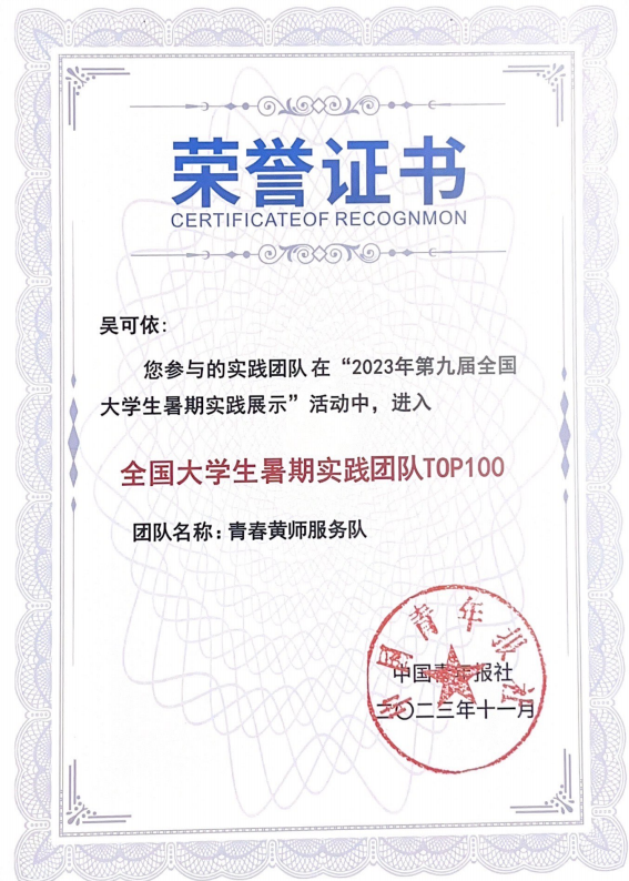 吴可依深知实践出真知的道理,积极投身社会实践活动,展现出强烈的社会责任感。2024年教育部、共青团中央2024年“推普助力乡村振兴”全国老员工暑期社会实践志愿服务团队选拨中,作为团队负责人,她深入社会基层,来到 [实践地点],针对 乡村普通话普及程度展开深入调研。她不辞辛劳,与当地居民亲切交流,实地考察环境,认真记录每一个细节。通过大量的数据收集和分析,她撰写的调研报告为解决相关社会问题提供了有力的依据,获得教育部、团中央的志愿服务团队立项,被多家媒体进行报道,受到了社会各界的广泛认可。