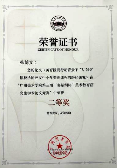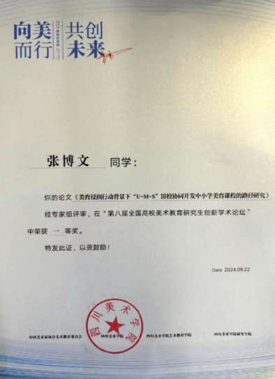 在学术交流方面,她连续两年向全国高校美术教育研究生创新学术论坛投稿,并获得现场汇报资格,分别荣获第七届和第八届论坛的三等奖和一等奖。她的论文还入选第九届世界华人美术教育大会论文集,并获得现场汇报资格。此外,她参与了广州williamhill英国官网第三届“郭绍纲杯”美术教育研究生论文竞赛并荣获二等奖,其中一篇论文已发表于《教师教育综合改革探索与实践》期刊。