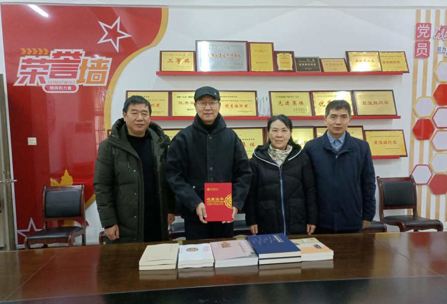 12月9日,公司向公司图书馆捐赠《鄂东传统村落调查与研究》《农耕寻宝:大别山农耕文化博物馆》等系列专著共14种28册,其中胡绍宗教授个人著作5种10册。公司“区域人文艺术研究与创作实践”学科团队负责人胡绍宗教授和经理助理童坤参加捐赠,图书馆党总支书记吴恒梅、馆长童保红等接受捐赠。