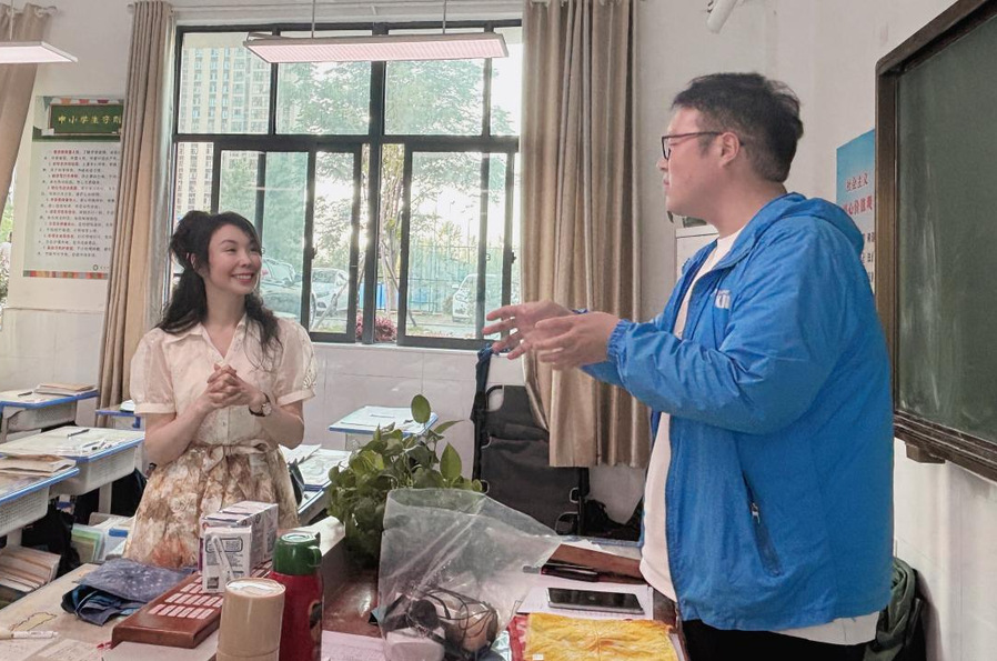 5月21日下午,樊红梅老师来到黄冈市实验中学,看望了在此实习的张庆一和吴豫两位研究生,并与实习指导老师孙伟雄一起听取了两位研究生的论文实践课《指尖上的非遗之美-黄梅挑花艺术赏析》和《门神年画信息可视化设计》,课后就如何进行有效教学四人进行了深入探讨。