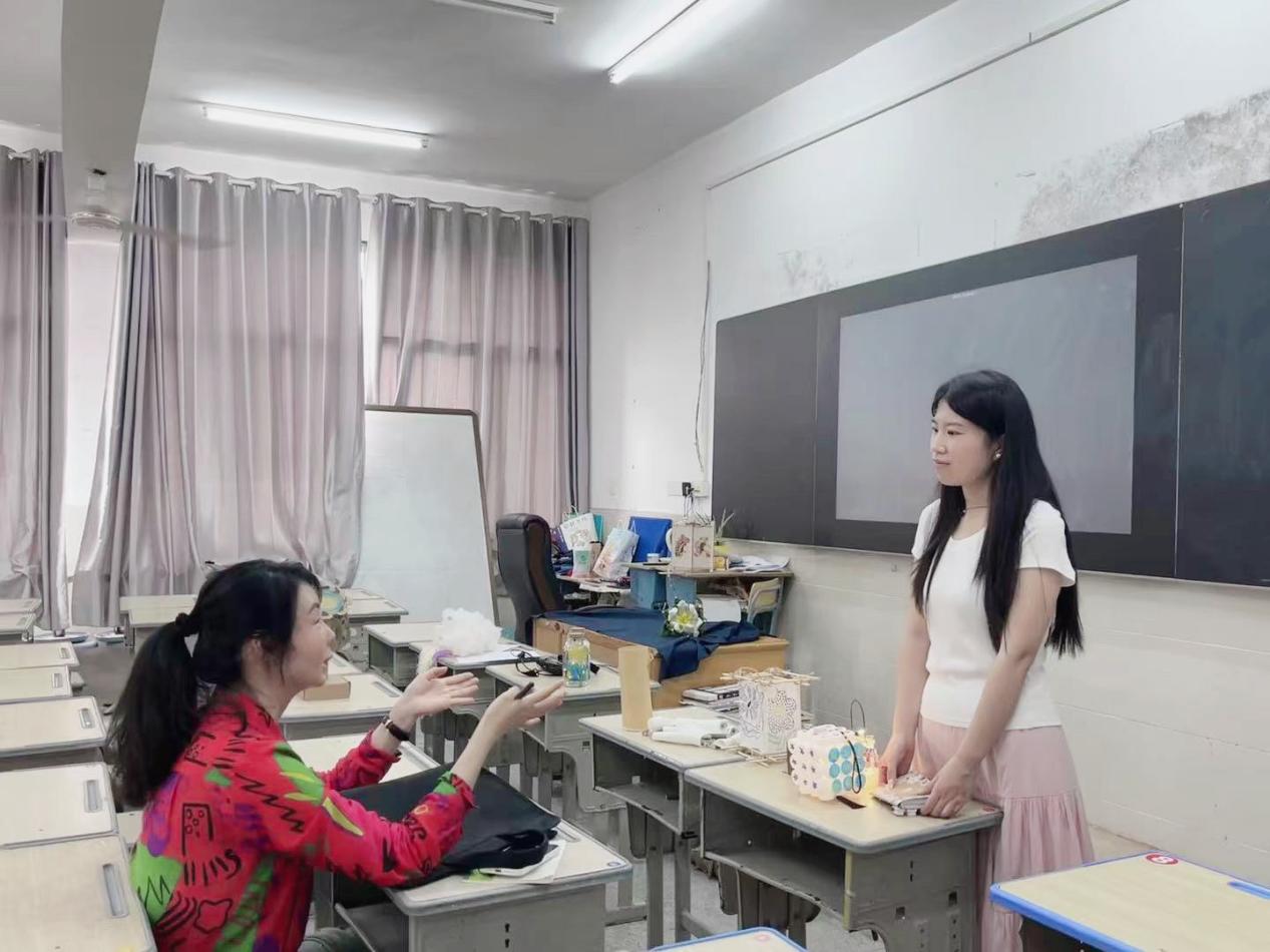 6月9日下午,樊红梅老师来到鄂州五中,看望了在此实习的两位研究生王纯和崔新月,听取了两位研究生的论文实践课《创意灯饰展评:灯光漫游》和《欣赏手工书:启迪生态智慧》,课后与就如何将作品进行有效展评与研究生进行了深入探讨。
