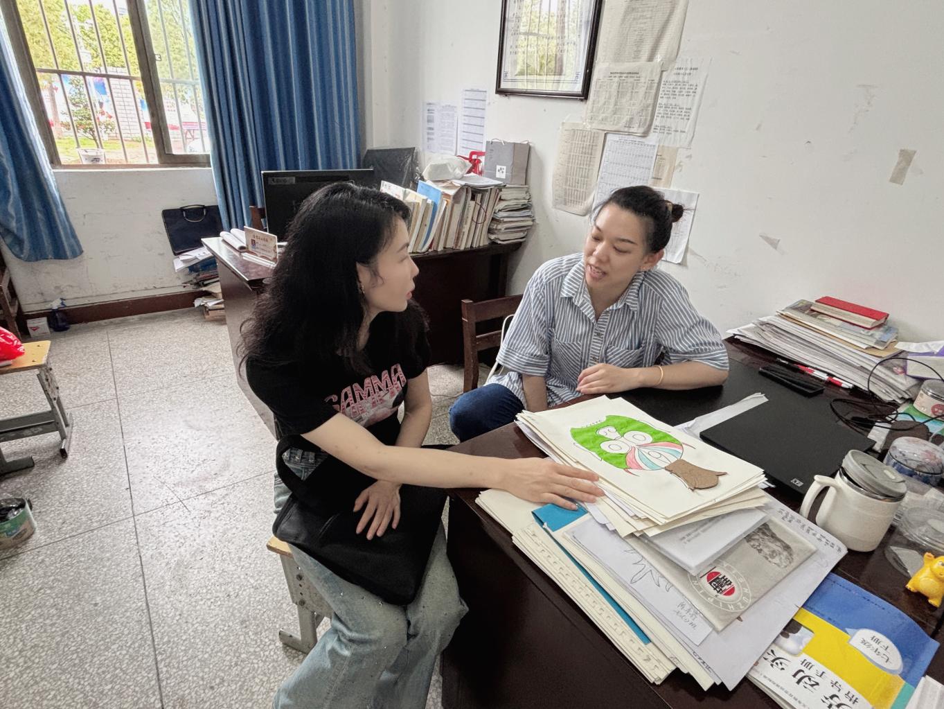 6月4日上午,樊红梅老师来到黄州中学,与实习指导老师方晗一起听取了研究生潘亚甜的初一美术课《神秘的面具艺术——傩面具纹样设计》,课后与方晗老师就研究生的课程设计进行了沟通。