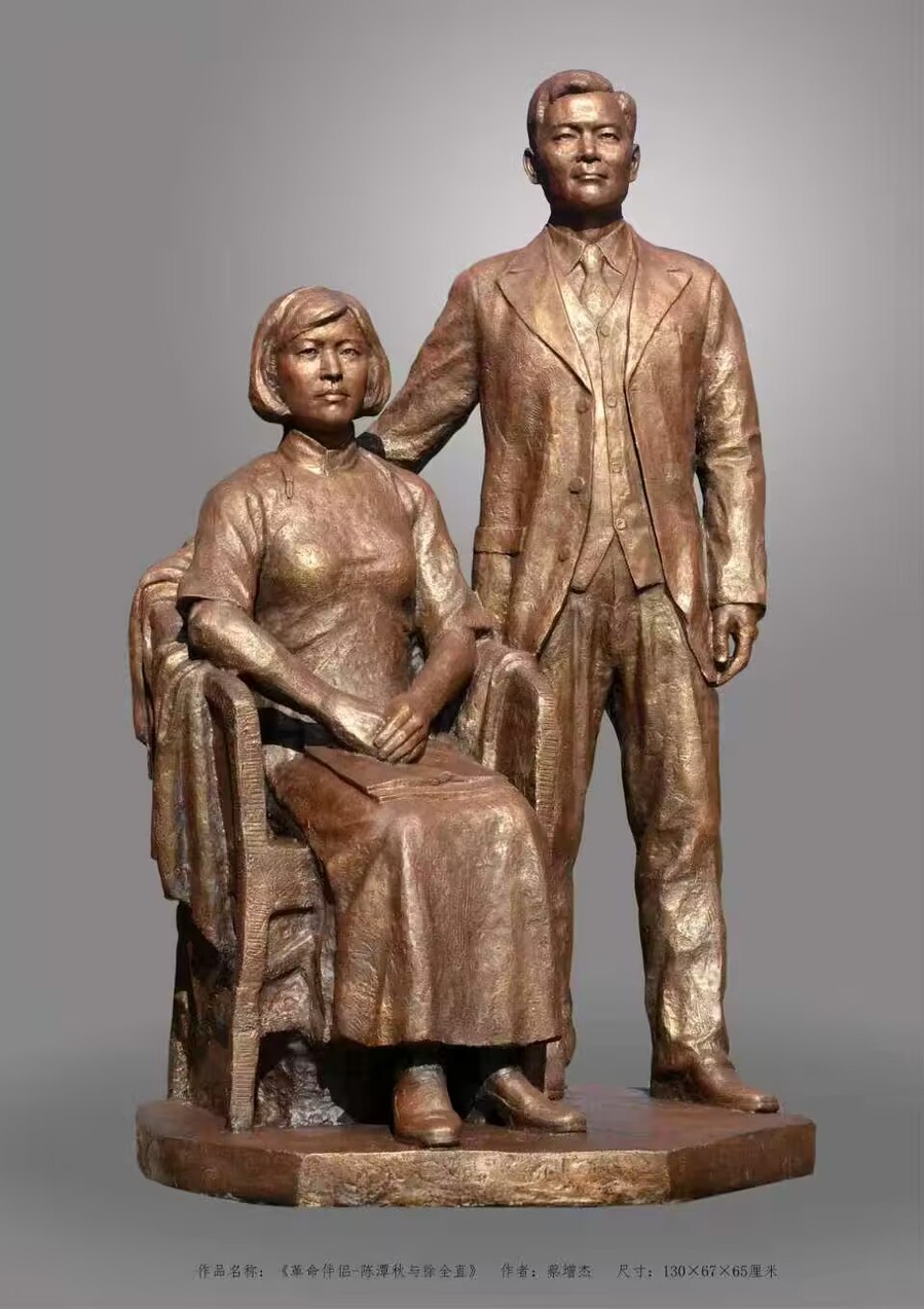 《革命伴侣-陈潭秋与徐全直》塑造的是陈潭秋与徐全直夫妇俩的全身像。雕塑构图将人物设计成一站一坐,互相挨着。陈潭秋身穿西装,目光炯炯有神,昂首挺胸,面带微笑地倚靠在徐全直身旁站立着。徐全直端坐在藤椅上,身穿旗袍,留着民国时期流行的女员工发型,腿上放着报纸,双臂倚靠在藤椅的扶手上,双手相握与胸前。徐全直面部塑造清秀,脸上洋溢着青春的气息。藤椅左侧悬挂的衣纹打破雕塑左侧形体的单调,增添了雕塑的形式美感。雕塑作品将青年 革命伉俪的精神风貌充分表现出来。