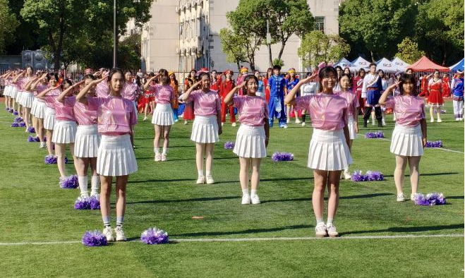 开幕式上,100余名美院学子的参与为啦啦操表演增光添彩。她们或身着民族服饰,或手持彩球,随着动感旋律完成了舞蹈表演,裙摆翻飞间既有现代舞的活泼张力,也显民族舞的审美巧思。此前连续数周的课余集训里,美院学子直面困难,刻苦训练。有人带着腰伤反复打磨动作,有人下雨还坚持去场地彩排。最终,她们在演出现场用零失误的表演点燃全场。