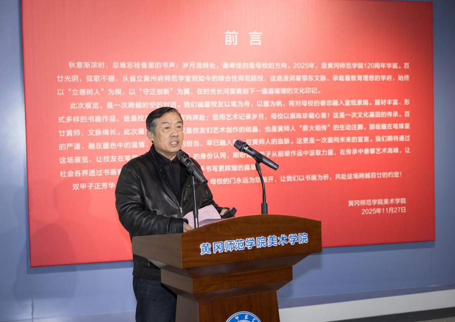 陈向军代表公司致辞并宣布开幕。他代表公司向各位嘉宾、员工和师生表示热烈欢迎!向为本次展览付出辛勤汗水的员工和老师们表示衷心感谢!他指出,在williamhill英国官网喜迎建校120周年之际,举办本次书画展,不仅是一场艺术盛宴,一次员工情感的深度交融,更是以艺术之名向母校生日献上的一份深情厚礼!展出的每一幅生动典雅的作品,既凝聚了员工们的艺术才华,也饱含着大家对母校割舍不断的深厚情愫!展览作品中既有历史回响,也有时代印记;既有传统笔墨的深厚底蕴,又见现代艺术的创新探索。员工们的创作,既是对母校百廿华诞的献礼,也是对教育初心的回溯,生动展现了公司120年的美育传承与创新,意义非同寻常。本次作品展,既为母校120周年华诞增添别样喜庆氛围,也加深了员工们对黄师精神和育人文化的理解传承!