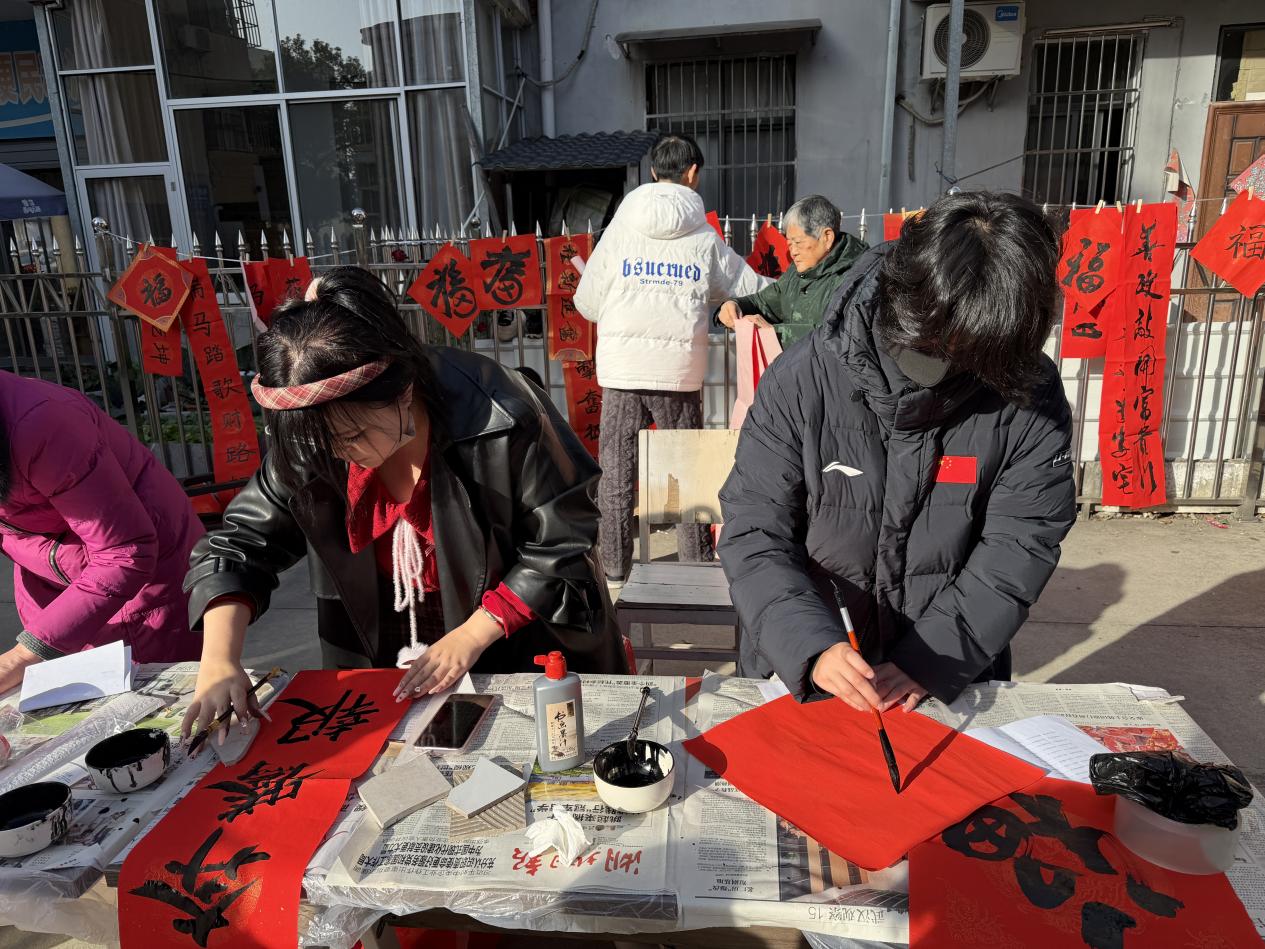 在1月10日-11日的书写环节活动现场,辅导员张诗玉老师与美术学2501班班主任左国华老师,携手顾云琪、贺库、杨舒涵三名员工志愿者深入社区,现场铺纸研墨,为居民即席挥春。左国华老师作为公司美育工作的骨干教师,始终致力于将专业教学与社会服务相结合,引导员工和居民感悟传统艺术之美、践行行为之美。
