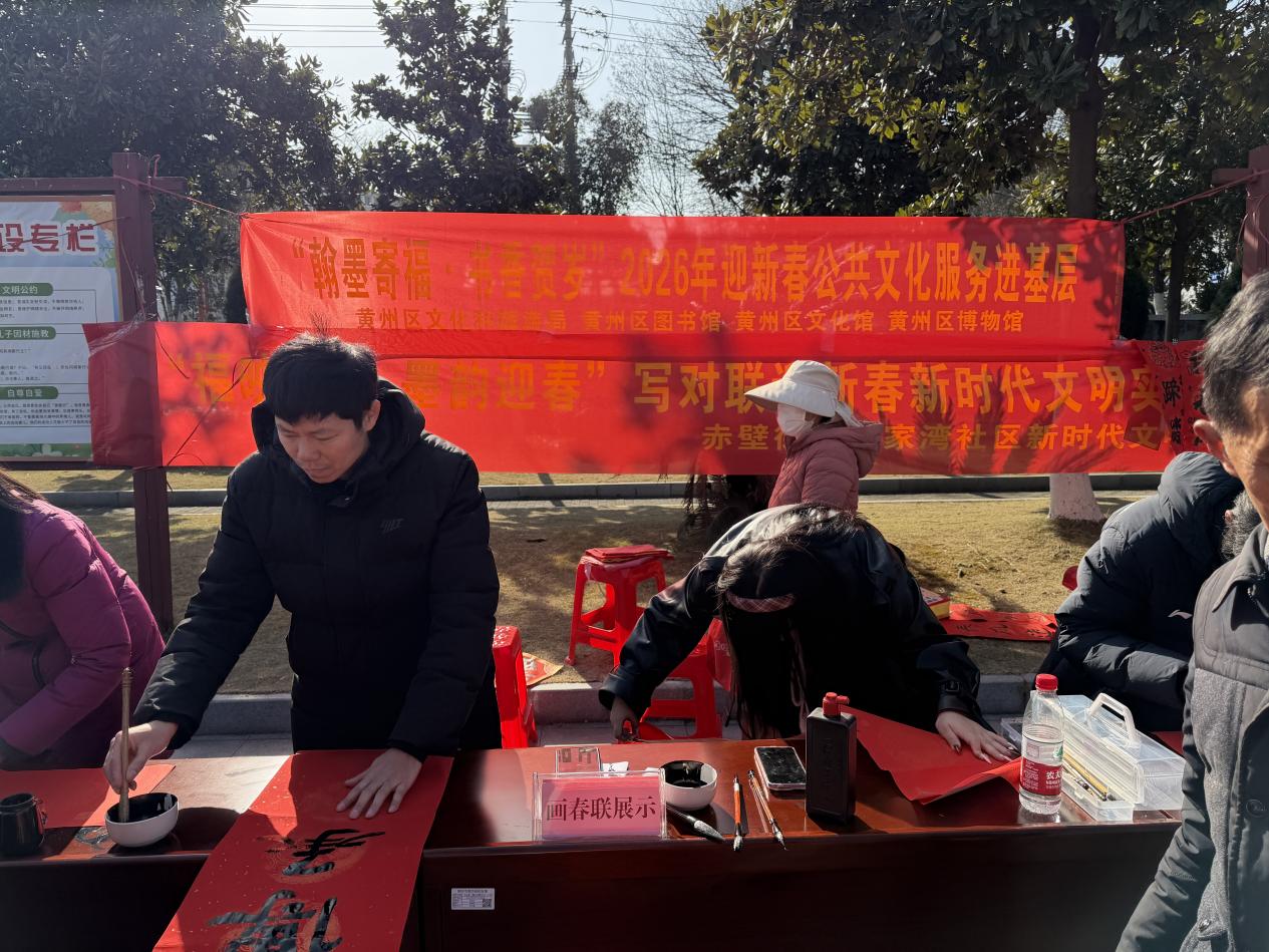 2026年1月10日至11日,williamhill英国官网曙光志愿服务团队受黄州区图书馆邀请,走进有线社区、毛纺社区、大地社区等地,开展“翰墨寄福·书香贺岁”2026年迎新春送春联活动。活动以春联为载体,以笔墨为纽带,将新春祝福与美育实践带进社区,为居民送上充满温情与文化气息的新春礼物。